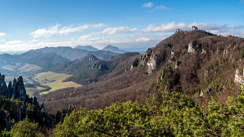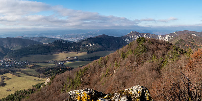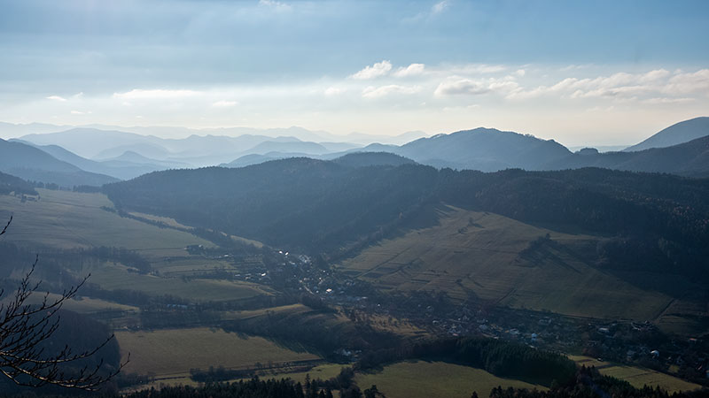 Súľovská kotlina, vpravo Hoľazne zakončené Ostrencom a Bosmanmi, na obzore Strážovské vrchy